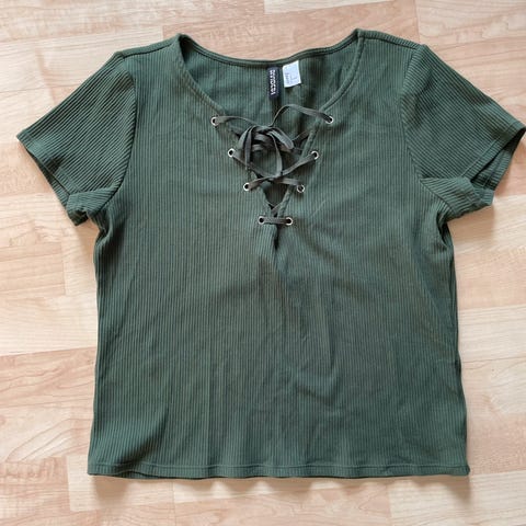 Ny eplegrønn t-shirt meddekor foran, blå kant rundt krage og ermer