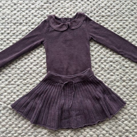 Ligger også ved en nydelig buksedress fra gullkorn.