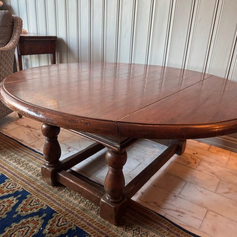Salongbordet måler når begge klaffer er slått ned 148×73. Når begge klaffene er slått ut er bordet helt rundt (148x148).