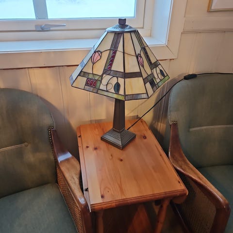 Bordlampe i Tiffany-stil med farget glass i mønster. Lampen har en firkantet form med dekorative detaljer i tre, metall og glasspaneler i forskjellige farger. Egnet som dekorativ belysning i hjemmet eller hytta.