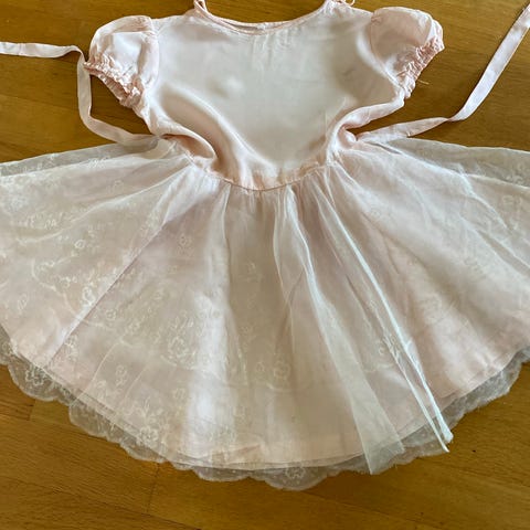 Selger en søt vintage kjole i blomstrete mønster med rosa og grønne detaljer.