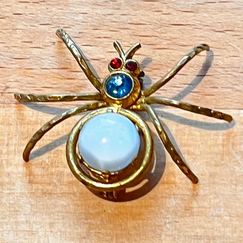 Brosjen har en detaljert edderkoppform med en større rød stein som kropp og mindre grønne steiner som øyne.