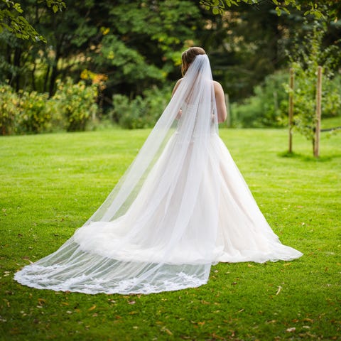 300cm langt brudeslør. Jeg kjøpte denne i USA men ikke brukt til bryllupet mitt. Veldig pent og ubrukt! Den er hvit med gullglitter