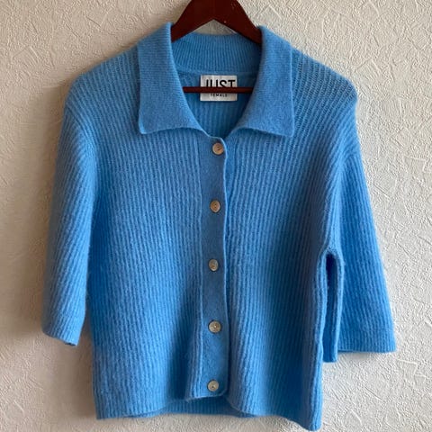 Just Female lang cardigan i størrelse M, lys gråblå farge. Strikkejakke i ullmiks med lommer foran. Ermene består av 70% angora og 30% nylon. Resten bestårav 60% viskose, 45% nylon og 5% angora.