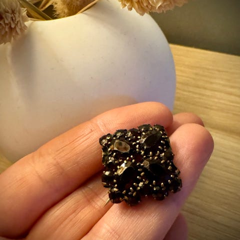 En vakker, håndlaget ring bestående av små, glansfulle sorte perler i glass/akryl, som er nøye tredd sammen i et tett og jevnt mønster.