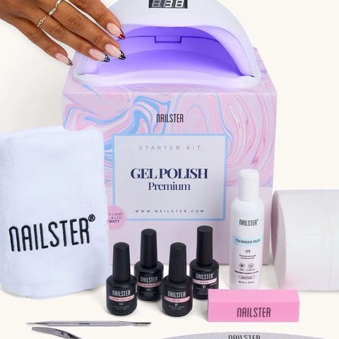 Fullt kid for gellack. UV lampe, base, builder og top coat. Diverse farger brukt én gang.