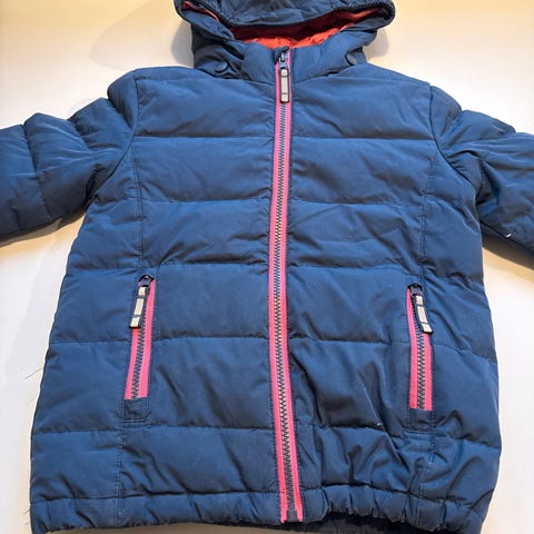 Reflex boblejakke for barn i størrelse 98. Jakken er blå med detaljer på glidelås og innsiden. Den har hette og er polstret for varme.