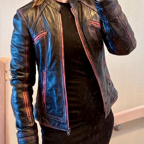 Jakken er laget i mykt kunstskinn (100 % polyuretan) med mykt og varmt fôr i imitert saueskinn (100 % polyester).