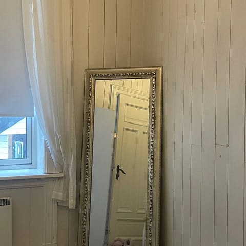 Sjarmerende gammelt speil, helfigurspeil med profilert ramme i sølv/gull med patina og fasettslipt glass. Måler 128cm høyt og 38cm bredt. Hentes på Torshov. Heis. Buss 20 og 30 stopper rett utenfor.
