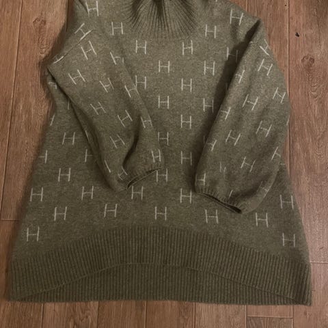 HÉST genser i blå farge, størrelse L for kvinner. Genseren har et mønster med bokstaven H og er laget i et mykt materiale som gir komfort ved bruk.