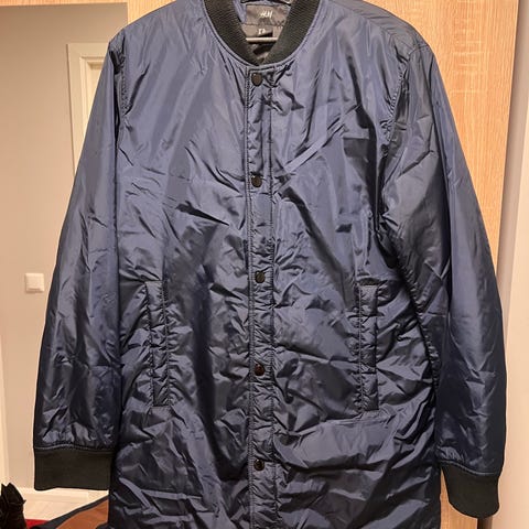 H&M Jakke i størrelse M, grå farge. Jakken har glidelås foran og en strukturert overflate. Egnet for menn og kan brukes som ytterplagg ved kjøligere vær.