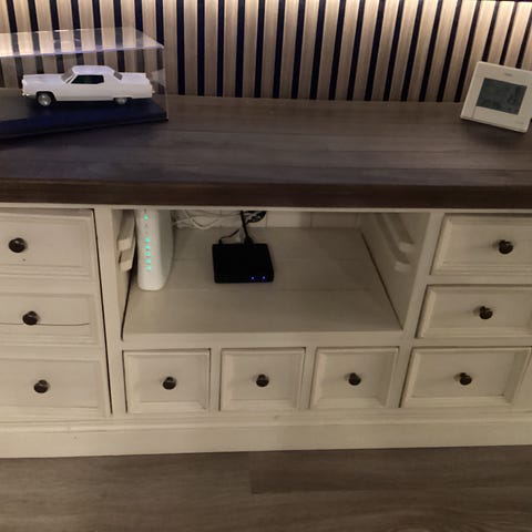 TV-seksjon i tre med vitrineskap og oppbevaringsplass