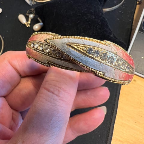 Perlene er ‘vintage’ (70talls) men omtrukket på ny tråd av meg for flere år siden og tilsatt sølv beads og små blomst med asymmetriske mellomrom for å gi kjeden og armbånd mere liv…