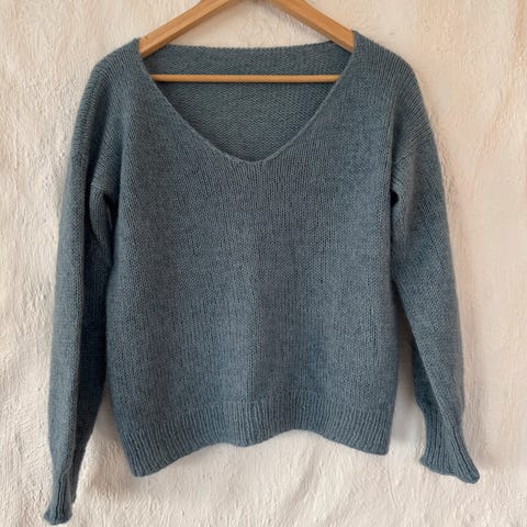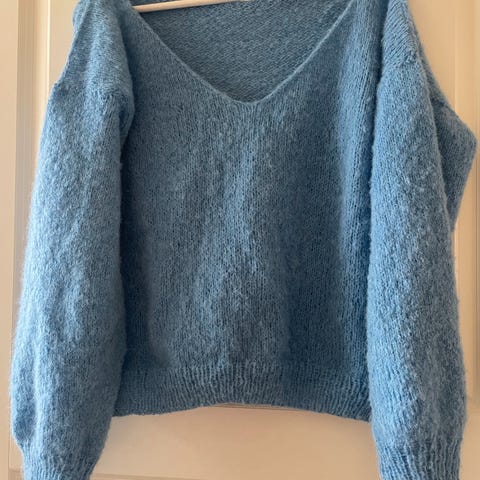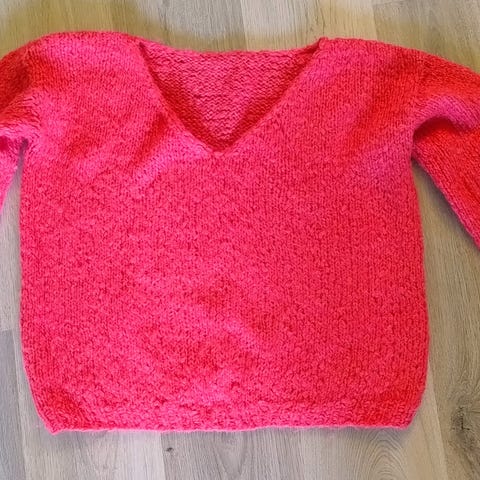 Ubrukt Amanda strikkegenser i en fin aprikosrosa farge. Lengde 51 cm, brystvidde 84 cm, ermelengde (fra sømkant) 46cm. Strikket i et røyk og dyrefritt hjem.