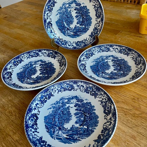 Ingen striper eller bruksmerker i glasuren på disse, men to skåler har ørsmå avchip på den grønne kanten. Selges samlet for 400,- Kan sendes