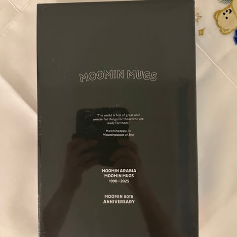 Ny og uåpnet jubileumsbok utgitt i forbindelse med Moomins day 2025. Den er produsert i 2025 eksemplarer og inkluderer minikoppen. Et flott samleobjekt.