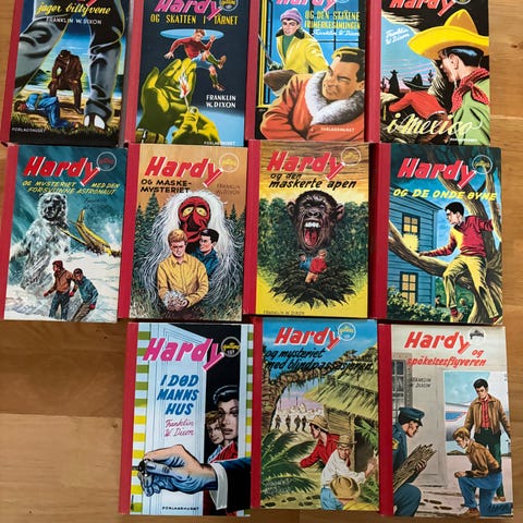 Hardy bokserie med ti røde innbundne romaner. Serien består av ulike titler med fargerike omslag på forsiden og røde ryggtitler. Bøkene er samlet i en serie og har varierende grad av slitasje på omslagene.