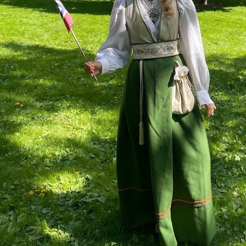 Jeg selger en hjemmesydd festdrakt lagd av gjenbrukstekstiler. Denne er helt unik.