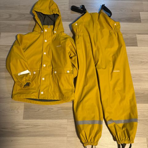 Regntøyet ble kjøpt nytt og har kun blitt brukt av ett barn.