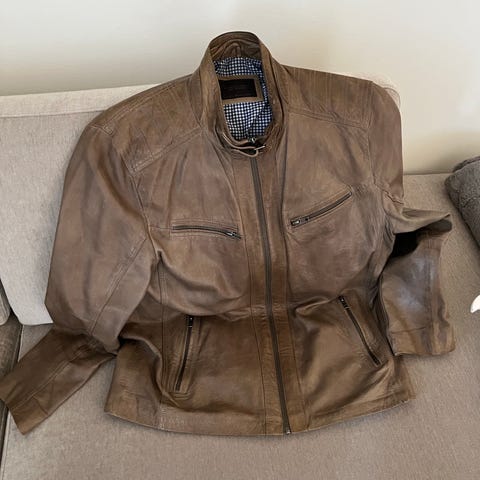 Meget fin vintage skinnjakke, med marmorert brunt skinn. Selges da den ikke passer helt og derfor brukes for lite lite
