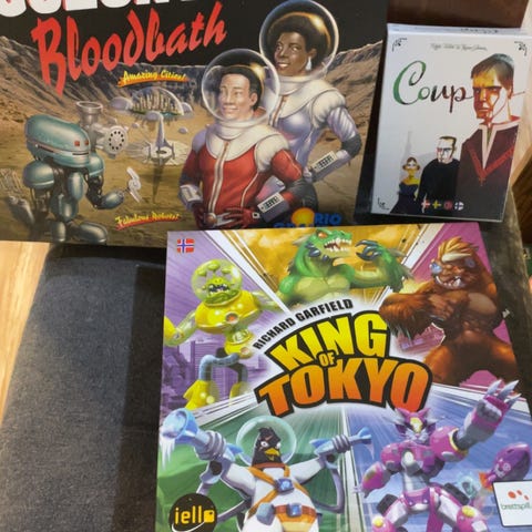 King of Tokyo brettspill med tema monsterkamp i Tokyo. Inneholder spillkomponenter som terninger, kort og spillebrett. Passer for 2-6 spillere.