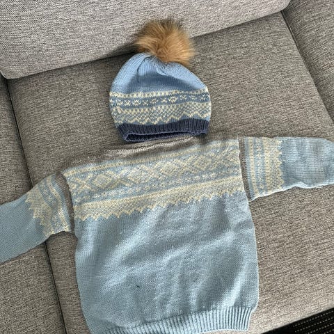 Hjemmestrikket grå/hvit/svart Mariusgenser og lue.
