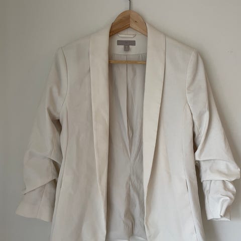 H&M blazer for kvinner i størrelse M. Jakken er hvit og laget av et materiale som gir en strukturert overflate. Den har en enkel knappelukking foran og to lommer på forsiden. Passer til formelle og uformelle anledninger.