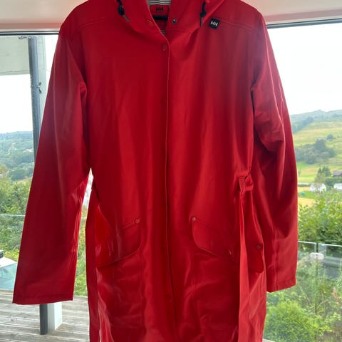 Selger en pent brukt rød Helly Hansen regnjakke.