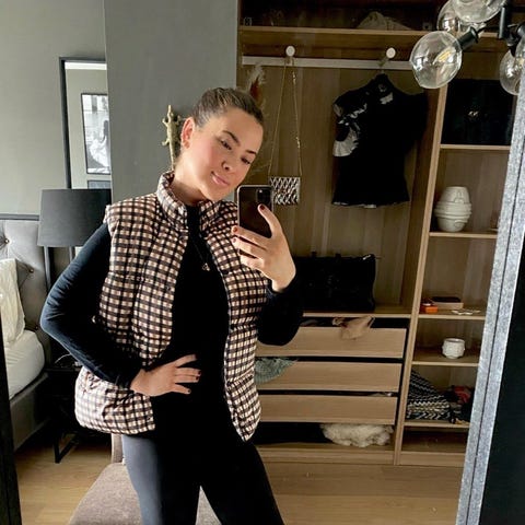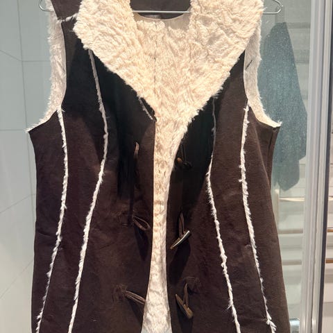 Vest med pjuskepels på hette, gul, sennepsgul, bronse(?)