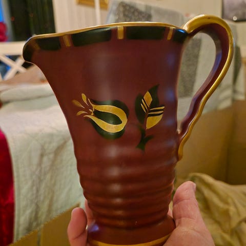 Unik vintage keramikkmugge, trolig norskprodusert, med dyp rød glasur og håndmalte gullmønstre. Muggen har elegant fasong med gullbelagt hank og dekorativt motiv rundt kroppen.