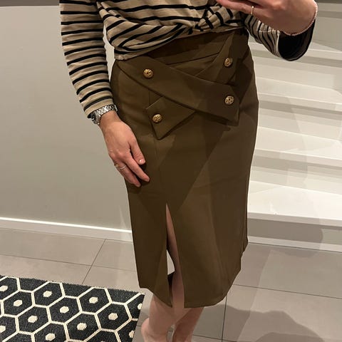 Kjempe fint Brunt skjørt med hvite prikker. Strikk i livet. Plizze. Med snorer til å henge opp skjørtet på henger.