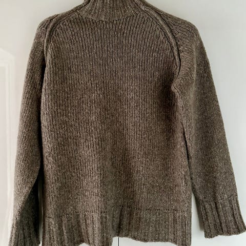 Ukjent merke genser for herre i størrelse XL. Genseren er brunmelert og har høy hals med ribbestrikk. Foran har den en bred flette langs midten, og det er ribbestrikk nederst på bolen og på ermene. Passer som hverdagsgenser eller som et ekstra lag på kjølige dager.