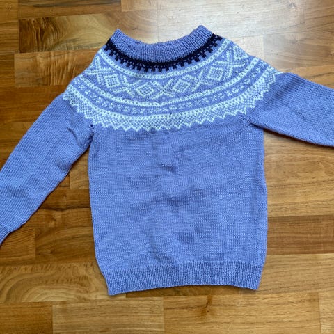 Selger en pent brukt hjemmestrikket genser i str 6-8 år. Genseren har en blågrå hovedfarge og mønster i lyseblått, og er lite brukt.