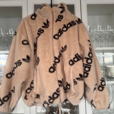 Pent brukt jakke i hvitt fleece/teddystoff fra Adidas Originals i størrelse S/36. En utrolig god høst eller vårjakke. Den har en glatt innside og lommer. Oversized fit.