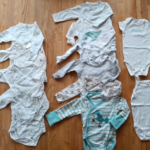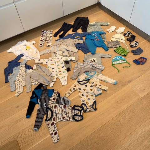 Selger en baby klespakke størrelse 50-56. Mest er neutral og hvit farge. Merker er h&m, cubus og name it. Pris 500 alle i pakke og selger alt i samme. Må hentes i Bergen (Fyllingsdallen område) eller sendes i post hvis kjøper betaler for frakt.