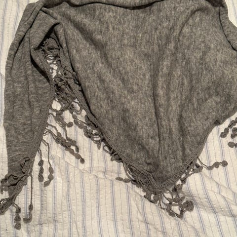 Pent brukt skjerf selges. Kan brukes på begge siden, ene siden sort med grå stjerner, andre siden grå med sorte stjerner.