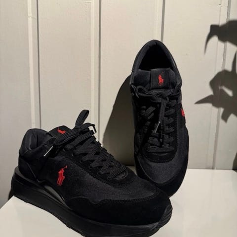 Lite brukt, mykje bruk igjen. Str 43, kanskje litt små i størrelsen. Synlig slitasje bakerst på hæl, elles ser dei ut som nye.