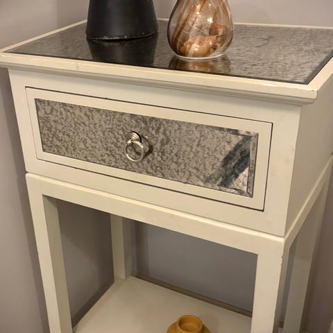 Selger et lekkert vitrineskap med fasettslipte glassdører og steinplate på topp. Topp og bunn 40*40 cm. Høyde 93-94 cm. Liten krakelering i steinplate, se bilde.