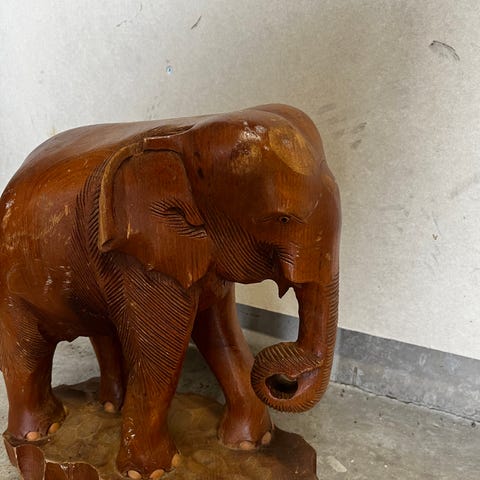 Selger en Elefant utskåret i tre. Den er 26 cm høy og brukes ofte som bokstøtte. Den ene støt tannen er litt kortere har mistet spissen. Kan sendes mot at kjøper betaler porto kr.69 med Post nord eller hentes i Rygge. Se også gjerne mine andre annonser.