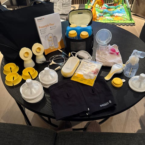 Veske, kjølebag, flasker, dobbel pumpe, pumpe bh og mer.