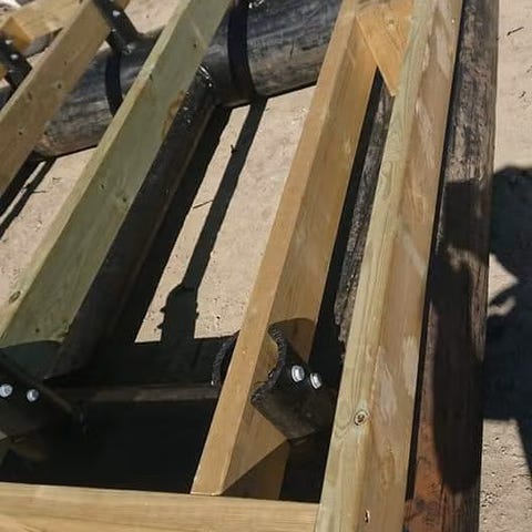 Godt brukt flytebrygge med blå tønner, brukt til badstuebrygge.
