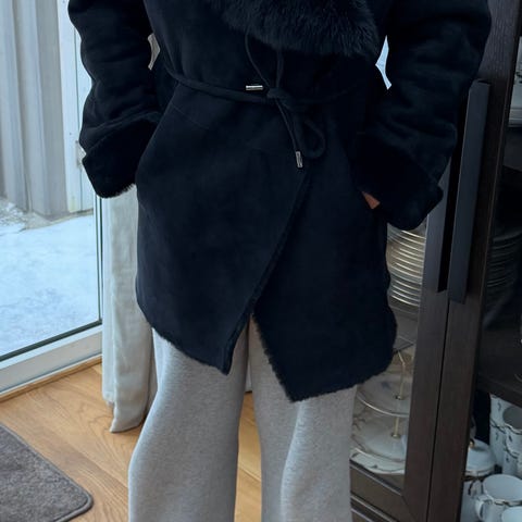 Varm og lekker jakke i lamaskinn med fine detaljer. Belte i livet. Nypris 12 000kr.