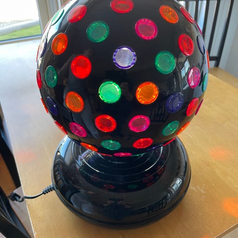 Roterende discopære med lys i flere farger selges, brukt i en barnebursdag. Tykk sokkel