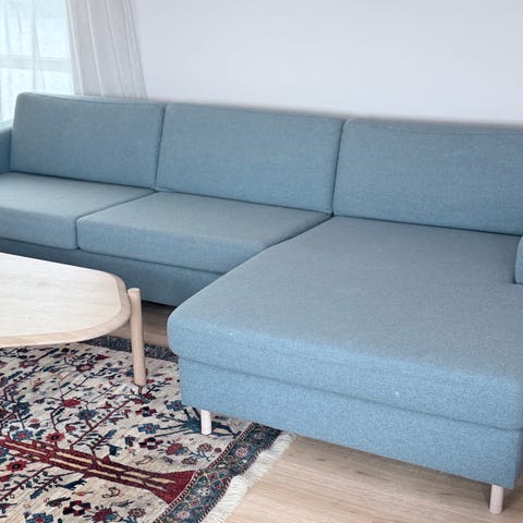 Bolia Scandinavia 3-seter og tilhørende puff med praktisk oppbevaringsplass. Puffen er 85x70 cm og kan være frittstående eller fungere som sjeselong.