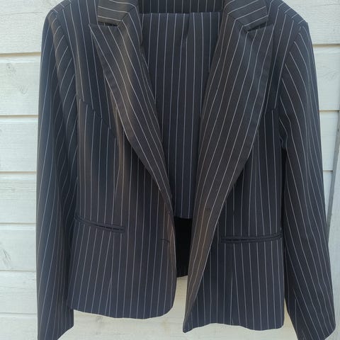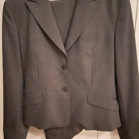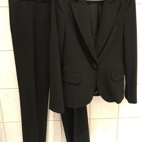 KappAhl dressjakke og bukser i svart farge, størrelse XL for kvinner. Dressjakken har knappelukking foran og to lommer med klaff. Buksene har knappelukking og lommer foran og bak. Passer til formelle anledninger eller kontorbruk.