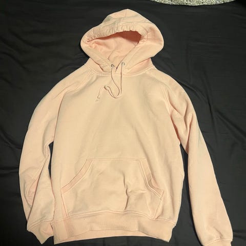 Bik Bok Hettegenser i rosa farge, størrelse S. Genseren har hette med snøring og er laget for kvinner. Materialet gir en myk og varm følelse, egnet for hverdagsbruk.