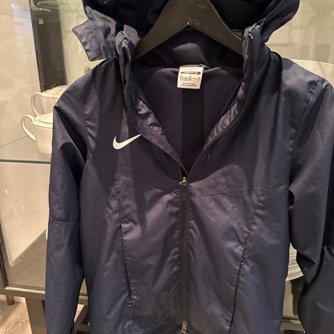 Nike Fotball Jakke i størrelse M, unisex. Jakken er marineblå og har hette. Den er laget for sportsbruk, spesielt fotball, og har en glidelås foran og lommer. Materialet er lett og egnet for utendørsaktiviteter.