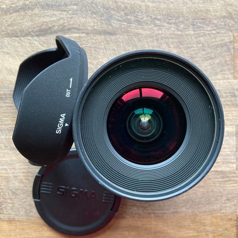 Sigma 10-20mm f/4-5.6 EX DC HSM kameraobjektiv med vidvinkelzoom, egnet for digitale speilreflekskameraer. Objektivet har en brennvidde på 10-20mm, blenderåpning fra f/4 til f/5.6, og inkluderer Hyper Sonic Motor (HSM) for rask og stille autofokus. Passer for fotografering av landskap, arkitektur og interiør.