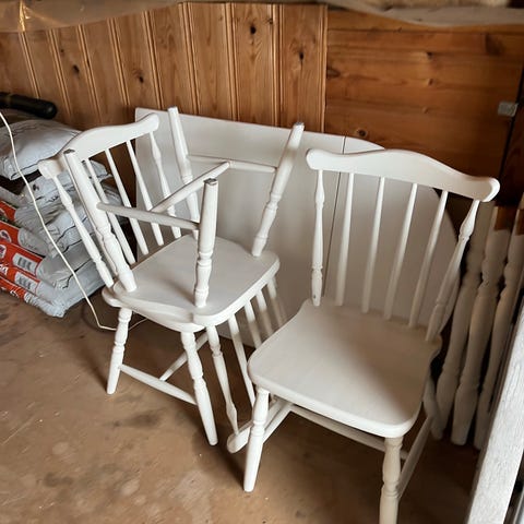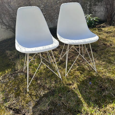 3 hvite stoler. Pris pr stol. 250 samlet. Den blå følger ikke med