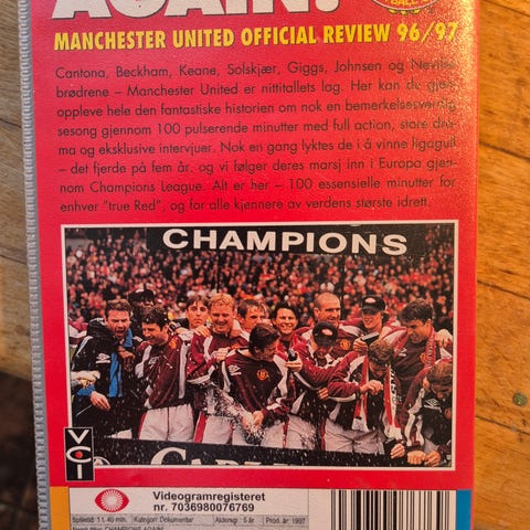 Manchester United Offisielle Review 96/97 VHS-kassett som dokumenterer sesongen 1996/1997. Inneholder høydepunkter, mål og kampsammendrag med spillere som Giggs, Beckham, Scholes og flere. VHS-kassetten leveres i original plastkassett med omslag.